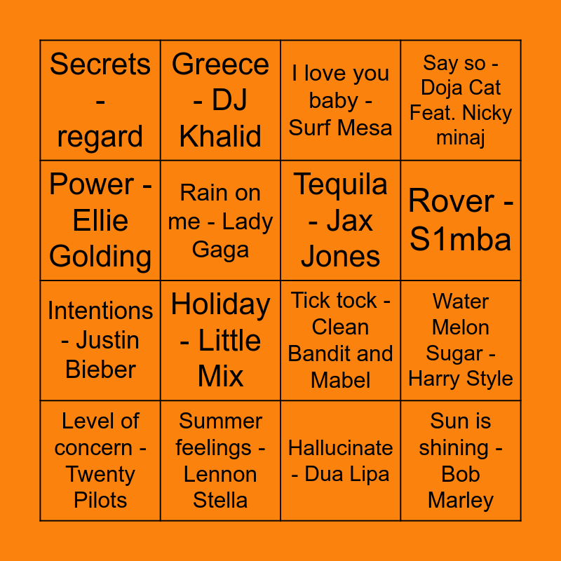 This bingo card has 16 words: Summer feelings - Lennon Stella, Water Melon Sugar - Harry Style, I love you baby - Surf Mesa, Secrets - regard, Intentions - Justin Bieber, Greece - DJ Khalid, Tick tock - Clean Bandit and Mabel, Hallucinate - Dua Lipa, Power - Ellie Golding, Rain on me - Lady Gaga, Level of concern - Twenty Pilots, Say so - Doja Cat Feat. Nicky minaj, Holiday - Little Mix, Rover -S1mba, Tequila - Jax Jones and Sun is shining - Bob Marley.