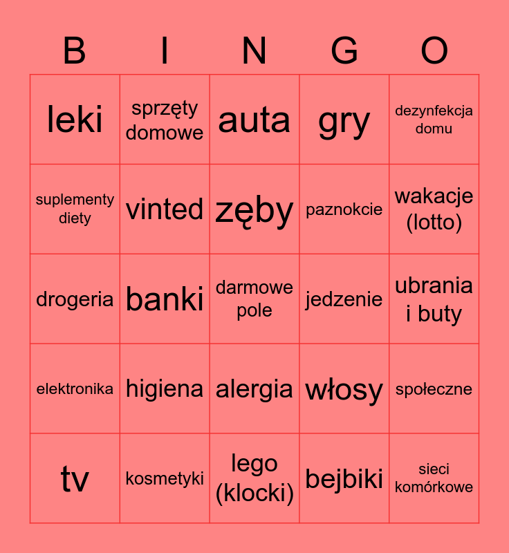 This bingo card has a free space and 24 words: higiena, kosmetyki, zęby, tv, dezynfekcja domu, leki, suplementy diety, sprzęty domowe, jedzenie, alergia, paznokcie, drogeria, włosy, społeczne, vinted, bejbiki, ubrania i buty, auta, wakacje (lotto), banki, sieci komórkowe, elektronika, gry and lego (klocki).