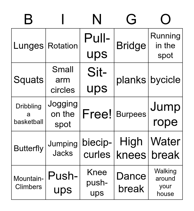 This bingo card has a free space and 24 words: Jumping Jacks, Push-ups, Sit-ups, Mountain- Climbers, Running in the spot, Lunges, Squats, Rotation, Burpees, biecip- curles, planks, Dribbling a basketball, High knees, Water break, Small arm circles, Dance break, Jump rope, Pull-ups, bycicle, Jogging on the spot, Walking around your house, Butterfly, Bridge and Knee push-ups.