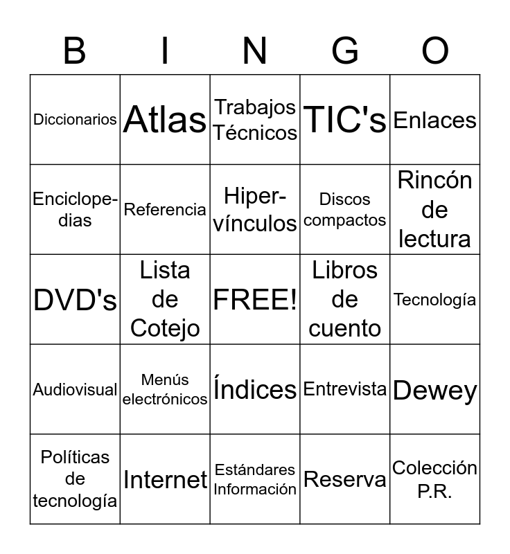 This bingo card has a free space and 24 words: Menús electrónicos, Internet, Hiper-vínculos, Políticas de tecnología, Enlaces, Diccionarios, Enciclope-dias, Atlas, Libros de cuento, Índices, Discos compactos, DVD's, Entrevista, Dewey, Referencia, Reserva, Tecnología, Trabajos Técnicos, Rincón de lectura, Lista de Cotejo, Colección P.R., Audiovisual, TIC's and Estándares Información.
