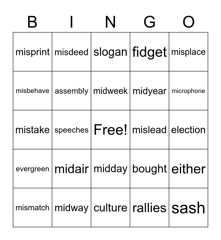 This bingo card has a free space and 24 words: midair, midway, midweek, mismatch, misplace, misprint, misbehave, misdeed, mislead, midday, midyear, mistake, bought, either, assembly, rallies, election, slogan, microphone, speeches, sash, evergreen, fidget and culture.