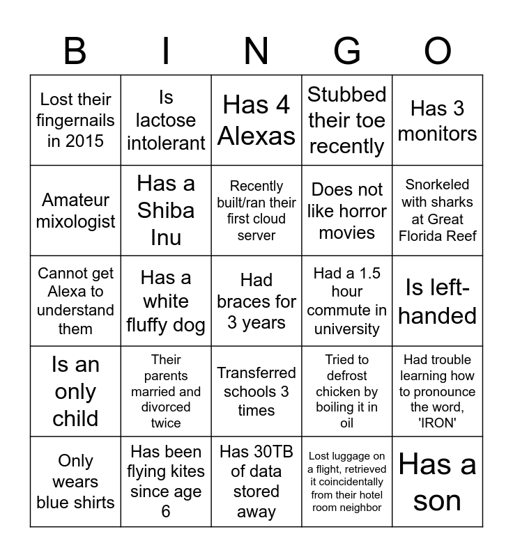 This bingo card has 25 words: Their parents married and divorced twice, Has 30TB of data stored away, Recently built/ran their first cloud server, Only wears blue shirts, Has 3 monitors, Lost their fingernails in 2015, Amateur mixologist, Is lactose intolerant, Had a 1.5 hour commute in university, Transferred schools 3 times, Does not like horror movies, Cannot get Alexa to understand them, Tried to defrost chicken by boiling it in oil, Had trouble learning how to pronounce the word, 'IRON', Has a Shiba Inu, Has a son, Is left-handed, Has 4 Alexas, Snorkeled with sharks at Great Florida Reef, Has a white fluffy dog, Had braces for 3 years, Has been flying kites since age 6, Is an only child, Stubbed their toe recently and Lost luggage on a flight, retrieved it coincidentally from their hotel room neighbor.