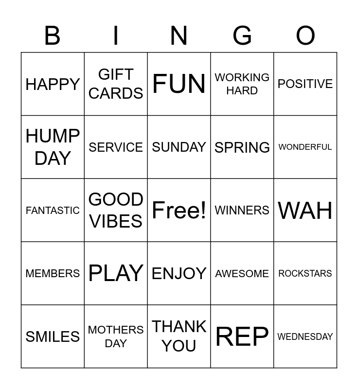 This bingo card has a free space and 24 words: PLAY, MOTHERS DAY, SUNDAY, SMILES, POSITIVE, HAPPY, HUMP DAY, GIFT CARDS, WINNERS, ENJOY, SPRING, FANTASTIC, AWESOME, ROCKSTARS, SERVICE, REP, WAH, FUN, WONDERFUL, GOOD VIBES, WEDNESDAY, MEMBERS, WORKING HARD and THANK YOU.