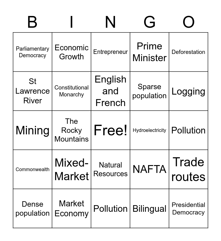 This bingo card has a free space and 34 words: Acid rain, Bilingual, Climate, Command economy, Commonwealth, Constitutional Monarchy, Deforestation, Dense population, Economic Growth, England and France, English and French, Entrepreneur, GDP, Human resources, Hydroelectricity, Logging, Market Economy, Mining, Mixed-Market, NAFTA, Natural Resources, Parliament, Parliamentary Democracy, Pollution, Pollution, Presidential Democracy, Prime Minister, Quebec, Sparse population, St Lawrence River, The Great Lakes, The Rocky Mountains, Trade routes and Traditional Economy.