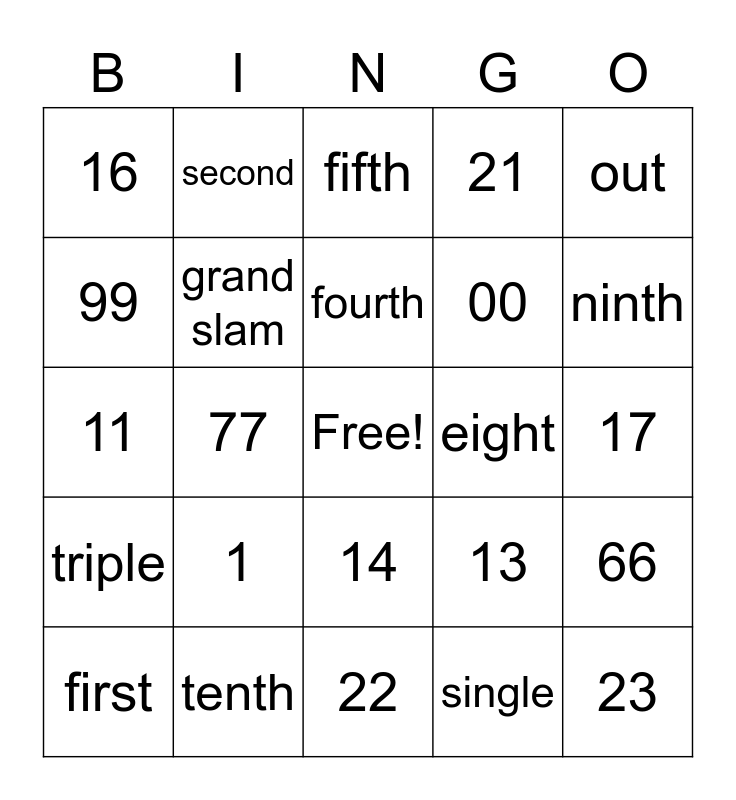 This bingo card has a free space and 34 words: Bat, single, double, homerun, triple, grand slam, out, first, second, third, fourth, fifth, sixth, seventh, eight, ninth, tenth, 11, 1, 13, 14, 15, 16, 17, 22, 23, 21, 20, 00, 99, 88, 77, 66 and 55.