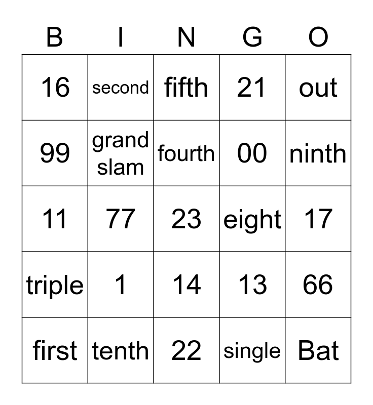 This bingo card has 34 words: Bat, single, double, homerun, triple, grand slam, out, first, second, third, fourth, fifth, sixth, seventh, eight, ninth, tenth, 11, 1, 13, 14, 15, 16, 17, 22, 23, 21, 20, 00, 99, 88, 77, 66 and 55.