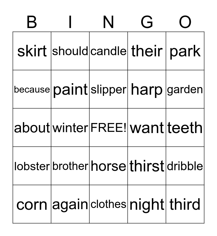 This bingo card has a free space and 24 words: brother, again, slipper, corn, park, skirt, because, should, want, horse, harp, about, thirst, dribble, paint, night, teeth, candle, garden, winter, third, lobster, their and clothes.