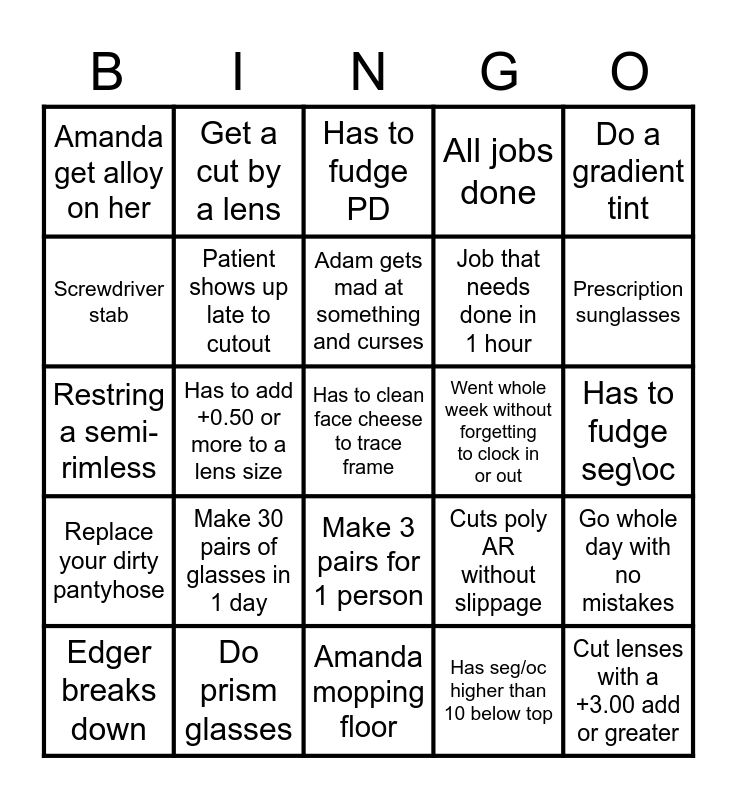 This bingo card has a free space and 24 words: Make 30 pairs of glasses in 1 day, Do prism glasses, Adam gets mad at something and curses, Edger breaks down, Do a gradient tint, Amanda get alloy on her, Screwdriver stab, Get a cut by a lens, Went whole week without forgetting to clock in or out, Make 3 pairs for 1 person, Job that needs done in 1 hour, Restring a semi-rimless, Cuts poly AR without slippage, Go whole day with no mistakes, Patient shows up late to cutout, Has seg/oc higher than 10 below top, Has to fudge seg\oc, Has to fudge PD, Prescription sunglasses, Has to add +0.50 or more to a lens size, Cut lenses with a +3.00 add or greater, Replace your dirty pantyhose, All jobs done and Amanda mopping floor.