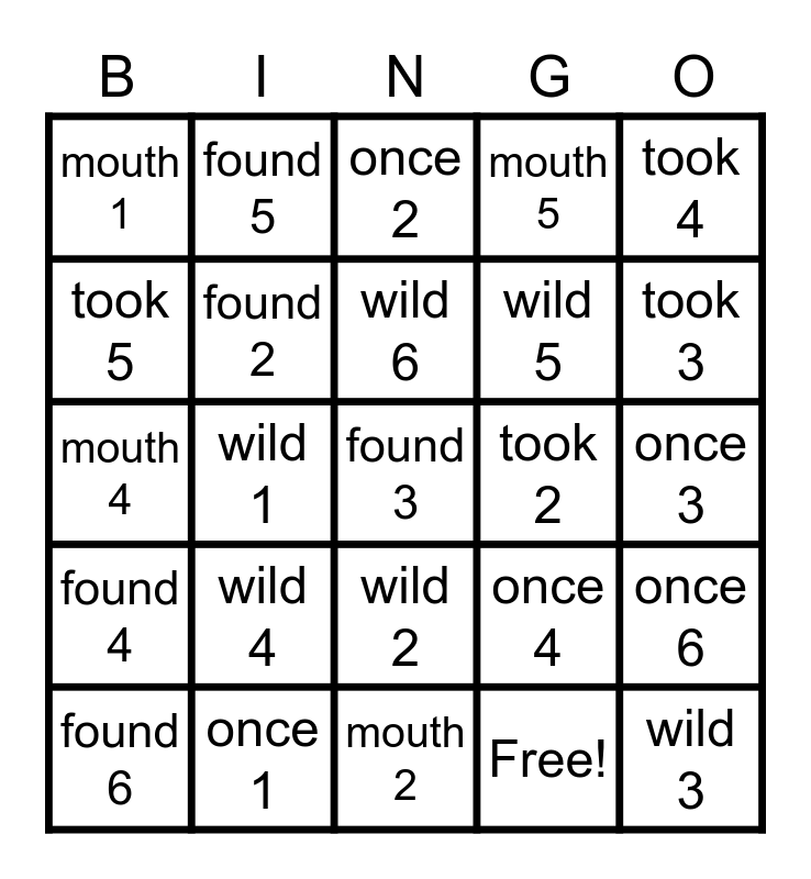 This bingo card has 30 words: once 1, found 1, wild 1, took 1, mouth 1, once 2, found 2, wild 2, took 2, mouth 2, once 3, found 3, Free!, wild 3, took 3, mouth 3, once 4, found 4, wild 4, took 4, mouth 4, once 5, found 5, wild 5, took 5, mouth 5, once 6, found 6, wild 6 and took 6.