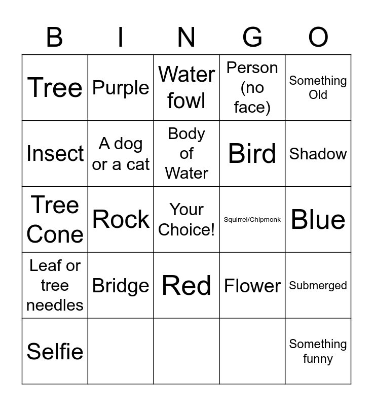 This bingo card has a free space and 21 words: Squirrel/Chipmonk, Flower, Purple, Red, Blue, A dog or a cat, Tree, Water fowl, Tree Cone, Body of Water, Bird, Person (no face), Leaf or tree needles, Bridge, Insect, Selfie, Something funny, Shadow, Something Old, Rock and Submerged.