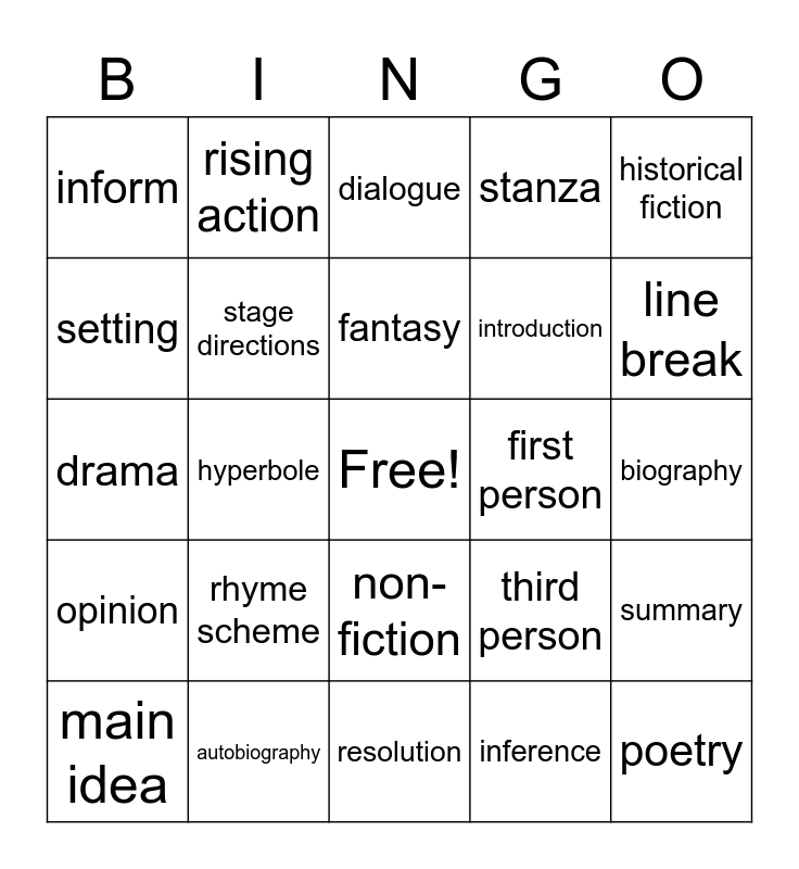 This bingo card has a free space and 46 words: persuade, poetry, realistic fiction, resolution, rhyme scheme, rhythm/meter, rising action, scene, setting, simile, stage directions, stanza, summary, third person, traits, falling action, fantasy, first person, genre, historical fiction, hyperbole, inference, inform, introduction, illustrator, line break, main idea, metaphor, non-fiction, opinion, personification, act, affix, alliteration, author’s purpose, autobiography, biography, cast, cause, climax, conclusion, dialogue, drama, effect, entertain and fact.