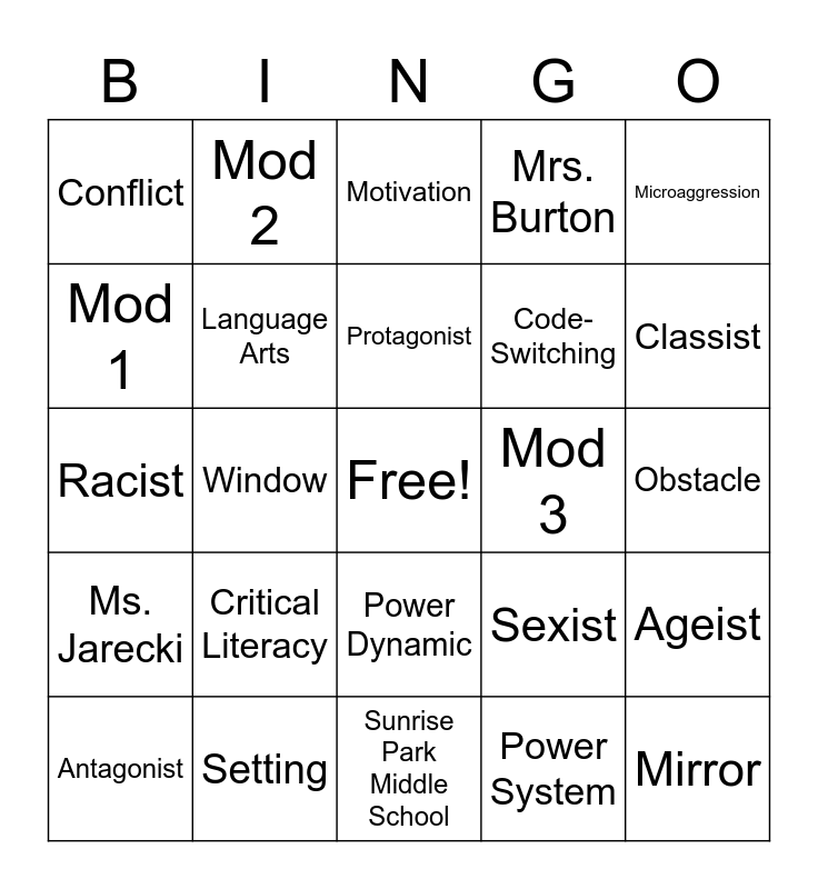This bingo card has a free space and 24 words: Critical Literacy, Setting, Protagonist, Antagonist, Microaggression, Conflict, Mod 1, Mod 2, Mod 3, Power Dynamic, Code-Switching, Racist, Sexist, Ageist, Language Arts, Power System, Obstacle, Motivation, Classist, Window, Mirror, Ms. Jarecki, Mrs. Burton and Sunrise Park Middle School.