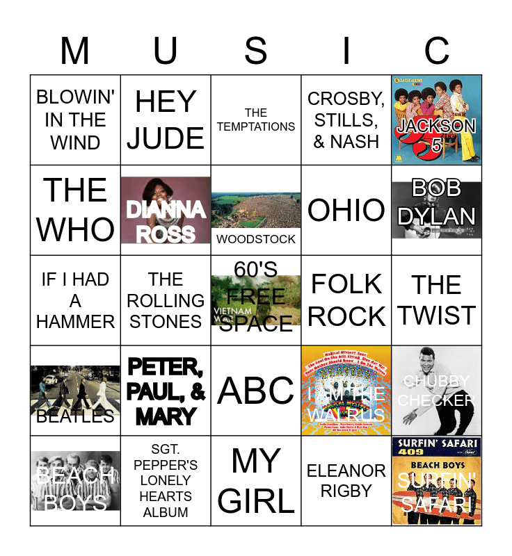 This bingo card has 9 images, a free space and 24 words: BEACH BOYS, PETER, PAUL, & MARY, WOODSTOCK, ELEANOR RIGBY, JACKSON 5, BLOWIN' IN THE WIND, HEY JUDE, THE TEMPTATIONS, FOLK ROCK, THE TWIST, IF I HAD A HAMMER, DIANNA ROSS, I AM THE WALRUS, CHUBBY CHECKER, THE WHO, SGT. PEPPER'S LONELY HEARTS ALBUM, MY GIRL, CROSBY, STILLS, & NASH, BOB DYLAN, BEATLES, THE ROLLING STONES, ABC, OHIO and SURFIN' SAFARI.