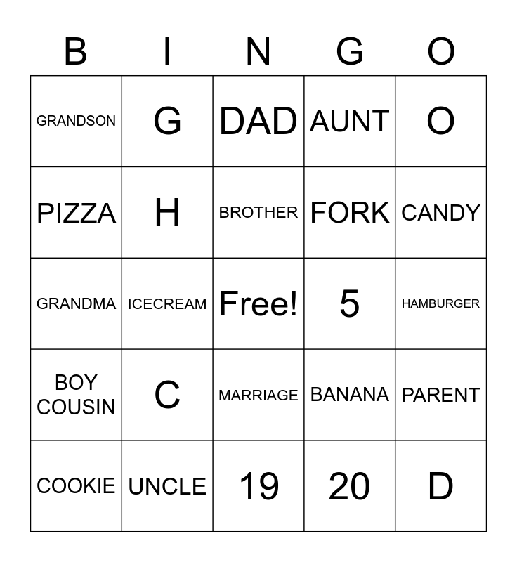 This bingo card has a free space and 90 words: 17, GRANDPA, MARRIAGE, BOY, SISTER, Q, CEREAL, BREAD, EGG, 13, T, KNIFE, SPOON, HAMBURGER, MOM, BROTHER, 14, M, FAMILY, CHEESE, BABY, WIFE/HUSBAND, 19, R, GRANDMA, UNCLE, GIRL, DAUGHTER, SON, GRANDDAUGHTER, ADULT, PARENT, GIRL COUSIN, BOY COUSIN, GRANDSON, AUNT, DAD, WATER, ICECREAM, CANDY, COOKIE, PIZZA, MILK, HOTDOG, APPLE, BANANA, CUP, PLATE, FOOD, COFFEE, DRINK, FORK, 1, 2, 3, 4, 5, 6, 7, 8, 9, 10, 11, 12, 15, 16, 18, 20, A, B, C, D, E, F, G, H, I, J, K, L, N, O, P, S, U, V, W, X, Y and Z.