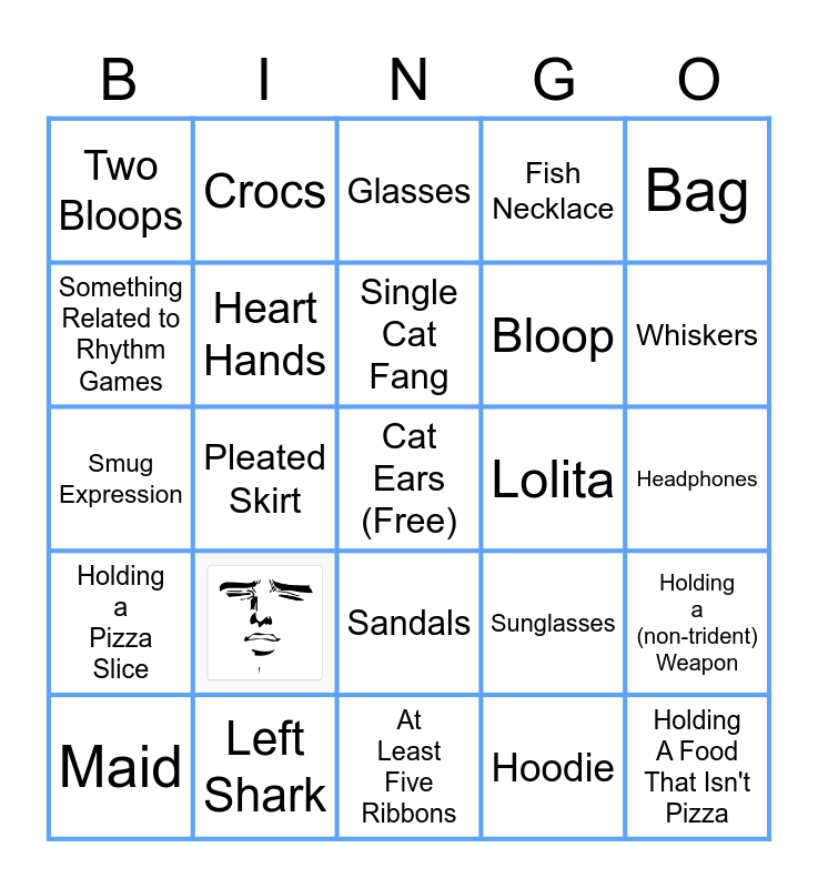This bingo card has 1 images, a free space and 28 words: Maid, Cat Tail, Pleated Skirt, Thigh Highs, Two Bloops, Glasses, Heart Hands, Lolita, Left Shark, Headphones, Holding A Food That Isn't Pizza, At Least Five Ribbons, Hoodie, Whiskers, Bathing Suit, Sandals, Holding a Pizza Slice, Bag, Smug Expression, Sunglasses, Sailor Collar, Bloop, Something Related to Rhythm Games, Fish Necklace, Crocs, Holding a (non-trident) Weapon, Single Cat Fang and Smol Gura.