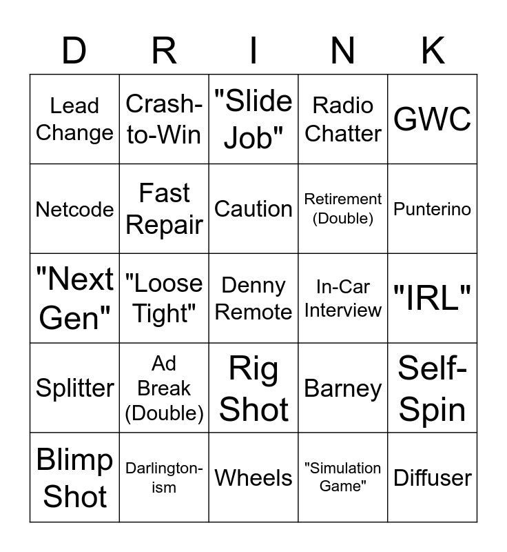This bingo card has a free space and 24 words: Ad Break (Double), Darlington-ism, Caution, Blimp Shot, GWC, Lead Change, Netcode, Crash-to-Win, In-Car Interview, Rig Shot, Retirement (Double), "Next Gen", Barney, Self-Spin, Fast Repair, "Simulation Game", "IRL", "Slide Job", Punterino, "Loose Tight", Diffuser, Splitter, Radio Chatter and Wheels.
