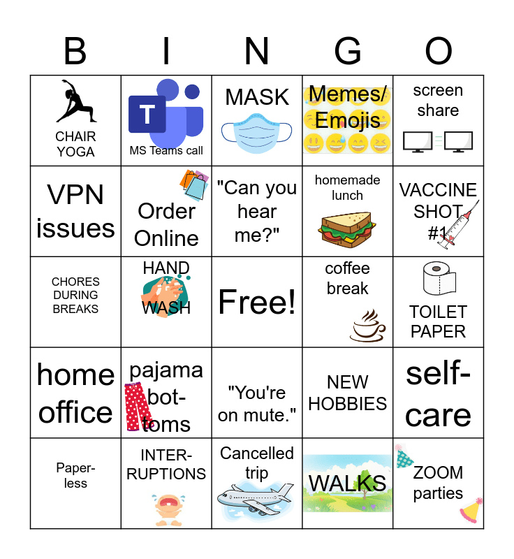 This bingo card has 16 images, a free space and 24 words: pajama bot- toms, INTER- RUPTIONS, "Can you hear me?", Paper-less, screen share, CHAIR YOGA, VPN issues, MS Teams call, coffee break, "You're on mute.", homemade lunch, CHORES DURING BREAKS, NEW HOBBIES, self-care, Order Online, WALKS, TOILET PAPER, MASK, VACCINE SHOT #1, HAND WASH, ZOOM parties, home office, Memes/ Emojis and Cancelled trip.