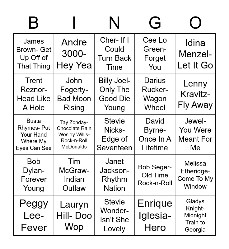 This bingo card has 26 words: Janet Jackson- Rhythm Nation, Enrique Iglesia- Hero, Billy Joel- Only The Good Die Young, Lauryn Hill- Doo Wop, Idina Menzel- Let It Go, James Brown- Get Up Off of That Thing, Trent Reznor- Head Like A Hole, Andre 3000- Hey Yea, Jewel- You Were Meant For Me, Bob Seger- Old Time Rock-n-Roll, Darius Rucker- Wagon Wheel, Busta Rhymes- Put Your Hand Where My Eyes Can See, Melissa Etheridge- Come To My Window, Peggy Lee- Fever, Tay Zonday- Chocolate Rain Wesley Willis- Rock-n-Roll McDonalds, Notorious B.I.G.- Mo Money, Mo Problems, Cee Lo Green- Forget You, Bob Dylan- Forever Young, Cher- If I Could Turn Back Time, Stevie Nicks- Edge of Seventeen, Lenny Kravitz- Fly Away, Stevie Wonder- Isn’t She Lovely, David Byrne- Once In A Lifetime, Tim McGraw- Indian Outlaw, John Fogerty- Bad Moon Rising and Gladys Knight- Midnight Train to Georgia.