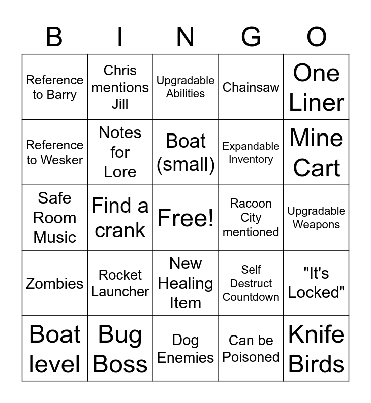 This bingo card has a free space and 24 words: Rocket Launcher, Bug Boss, Boat (small), Boat level, One Liner, Reference to Barry, Reference to Wesker, Chris mentions Jill, Racoon City mentioned, New Healing Item, Expandable Inventory, Safe Room Music, Self Destruct Countdown, "It's Locked", Notes for Lore, Can be Poisoned, Upgradable Weapons, Upgradable Abilities, Mine Cart, Find a crank, Knife Birds, Zombies, Chainsaw and Dog Enemies.