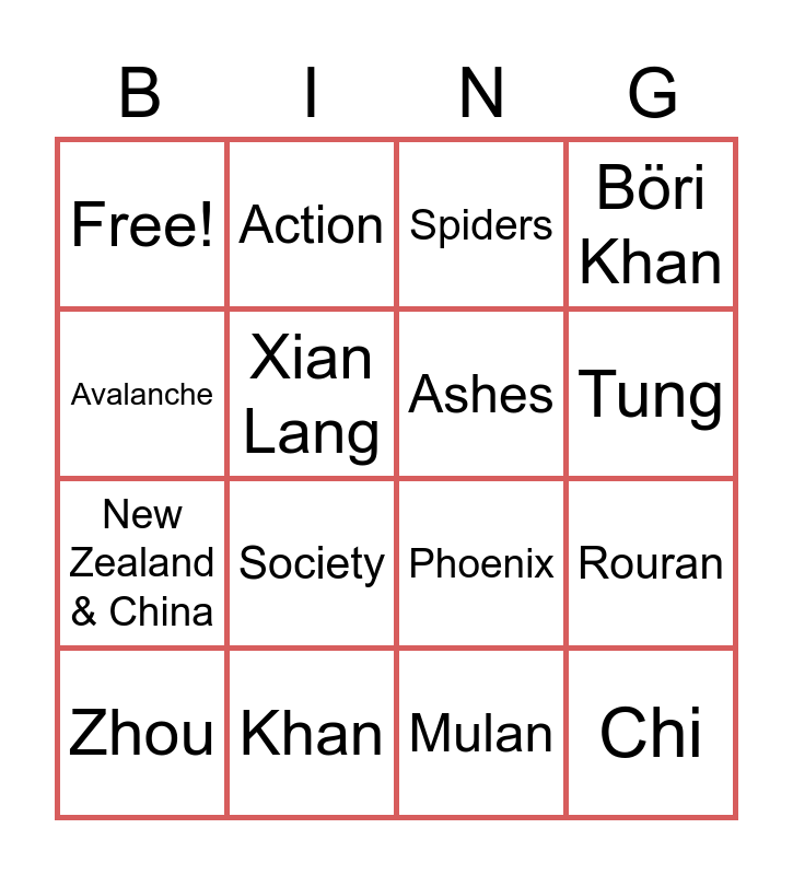 This bingo card has 16 words: Zhou, Khan, Spiders, Böri Khan, Avalanche, Action, Phoenix, Rouran, Free!, Xian Lang, Mulan, Tung, New Zealand & China, Society, Ashes and Chi.