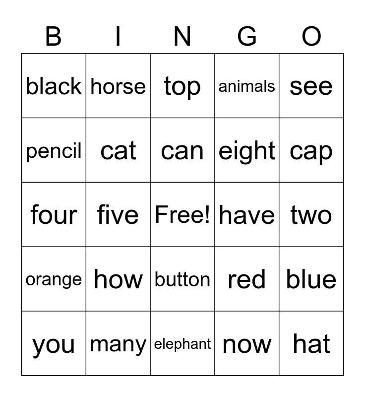 This bingo card has a free space and 24 words: how, many, can, you, see, black, pencil, horse, have, button, eight, four, red, blue, cat, now, two, top, cap, five, hat, orange, animals and elephant.