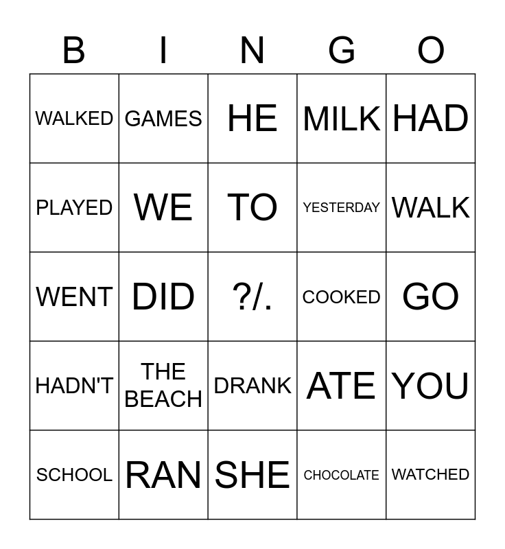This bingo card has a free space and 29 words: THE MOVIE, RAN, HE, NOT, HAD, WALKED, WE, TO, COOKED, YOU, SCHOOL, DID, CHOCOLATE, WATCHED, WENT, COOK, SHE, ATE, WALK, HADN'T, THE BEACH, LAST YEAR, YESTERDAY, GO, PLAYED, GAMES, DRANK, MILK and LAST MONTH.