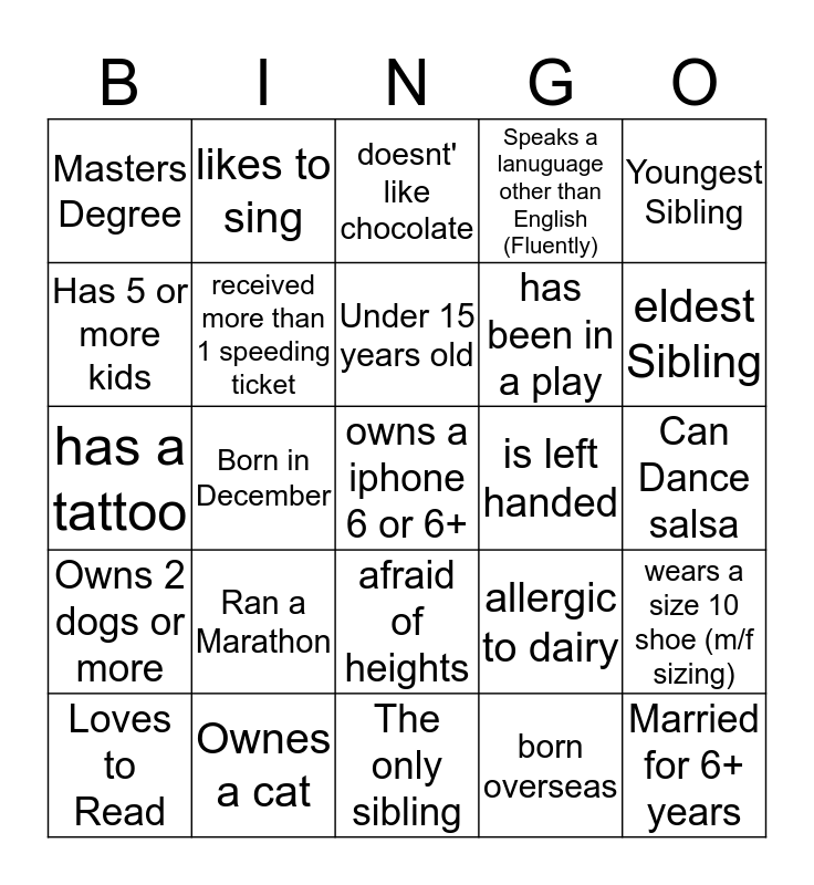 This bingo card has a free space and 24 words: Ran a Marathon, Ownes a cat, Under 15 years old, Loves to Read, Youngest Sibling, Masters Degree, Has 5 or more kids, likes to sing, is left handed, afraid of heights, has been in a play, has a tattoo, allergic to dairy, wears a size 10 shoe (m/f sizing), received more than 1 speeding ticket, born overseas, Can Dance salsa, doesnt' like chocolate, eldest Sibling, Born in December, Married for 6+ years, Owns 2 dogs or more, Speaks a lanuguage other than English (Fluently) and The only sibling.