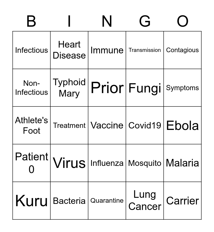This bingo card has a free space and 24 words: Virus, Bacteria, Prior, Kuru, Contagious, Infectious, Non-Infectious, Heart Disease, Covid19, Influenza, Fungi, Athlete's Foot, Mosquito, Malaria, Typhoid Mary, Lung Cancer, Ebola, Immune, Symptoms, Treatment, Carrier, Patient 0, Transmission and Quarantine.