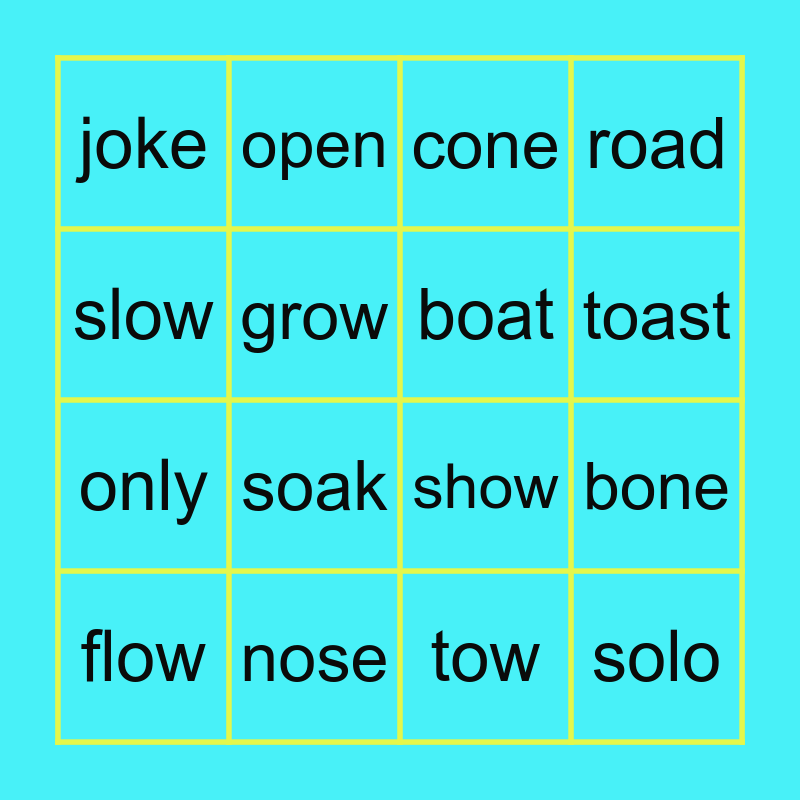 This bingo card has 16 words: nose, bone, cone, joke, only, open, show, tow, slow, grow, flow, road, soak, toast, boat and solo.