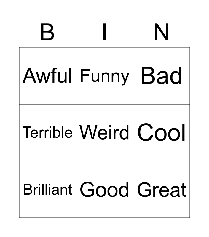 This bingo card has a free space and 10 words: Good, Bad, Awful, Great, Terrible, Brilliant, Funny, Fantastic, Cool and Boring.