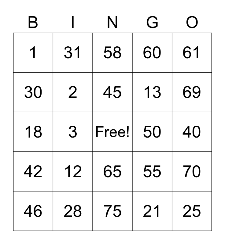 This bingo card has a free space and 24 words: 12, 28, 45, 46, 61, 1, 30, 31, 50, 65, 13, 18, 55, 70, 2, 21, 40, 58, 69, 3, 25, 42, 60 and 75.