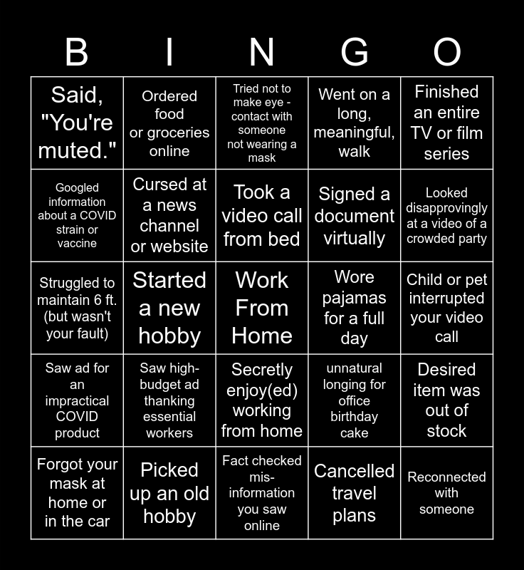 This bingo card has a free space and 24 words: Saw high-budget ad thanking essential workers, Picked up an old hobby, Took a video call from bed, Forgot your mask at home or in the car, Finished an entire TV or film series, Said, "You're muted.", Googled information about a COVID strain or vaccine, Ordered food or groceries online, Wore pajamas for a full day, Secretly enjoy(ed) working from home, Signed a document virtually, Struggled to maintain 6 ft. (but wasn't your fault), unnatural longing for office birthday cake, Desired item was out of stock, Cursed at a news channel or website, Cancelled travel plans, Child or pet interrupted your video call, Tried not to make eye -contact with someone not wearing a mask, Looked disapprovingly at a video of a crowded party, Started a new hobby, Reconnected with someone, Saw ad for an impractical COVID product, Went on a long, meaningful, walk and Fact checked mis-information you saw online.