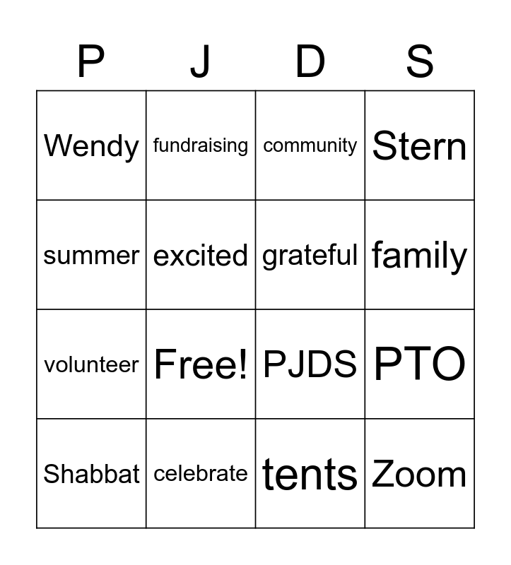 This bingo card has 18 words: Free!, Zoom, community, Wendy, PJDS, Stern, Shabbat, fundraising, family, volunteer, tents, summer, PTO, excited, grateful, outdoor, celebrate and fun.