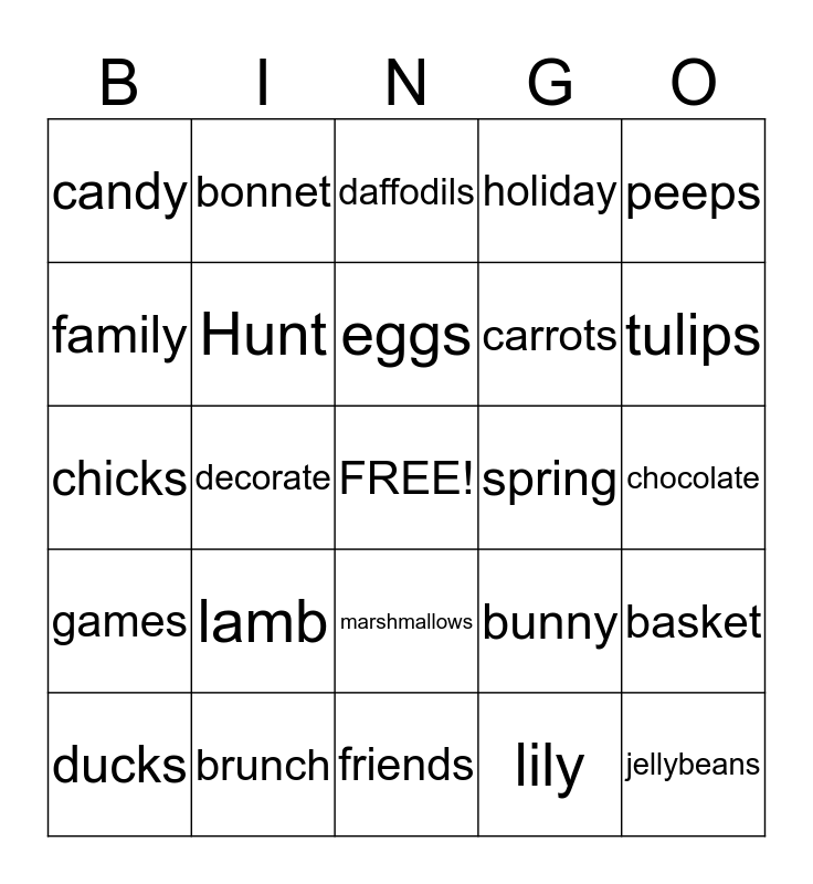 This bingo card has a free space and 24 words: lamb, brunch, eggs, ducks, peeps, candy, family, bonnet, spring, marshmallows, carrots, chicks, bunny, basket, Hunt, lily, chocolate, daffodils, tulips, decorate, jellybeans, games, holiday and friends.
