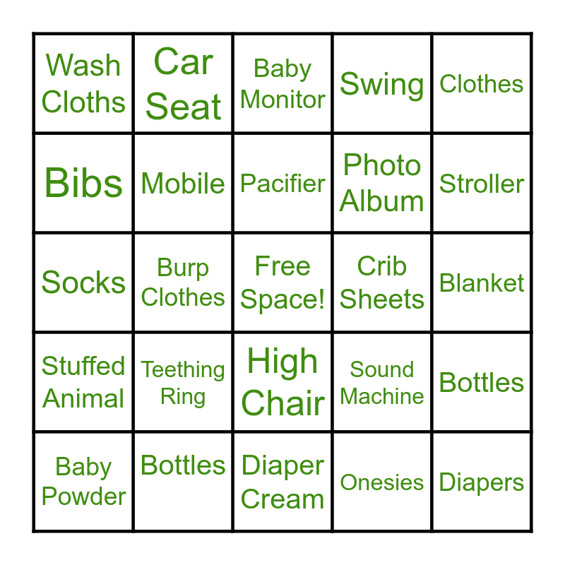 This bingo card has a free space and 24 words: Teething Ring, Bottles, Pacifier, Baby Powder, Clothes, Wash Cloths, Bibs, Car Seat, Crib Sheets, High Chair, Photo Album, Socks, Sound Machine, Bottles, Mobile, Onesies, Blanket, Baby Monitor, Stroller, Burp Clothes, Diapers, Stuffed Animal, Swing and Diaper Cream.