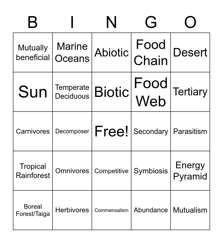 This bingo card has a free space and 33 words: Producer, Consumer, Decomposer, Biome, Tropical Rainforest, Temperate Deciduous, Desert, Boreal Forest/Taiga, Marine Oceans, Freshwater, Biotic, Abiotic, Interdependency, Primary, Secondary, Tertiary, Herbivores, Carnivores, Omnivores, Symbiosis, Competitive, Predatory Interactions, Mutually beneficial, Parasitism, Commensalism, Mutualism, Food Chain, Food Web, Sun, Energy Pyramid, Scarcity, Abundance and Wetlands.