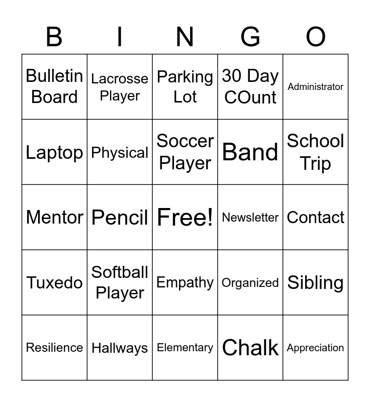 This bingo card has a free space and 85 words: Dance, Computer, Parking Lot, Choir, Bells, Pens, Support, Files, Graduate, Ruler, Phone, Secondary, Physical, Newsletter, Runner, Bulletin Board, Resilience, Laptop, School, Immunization, Uniforms, Band, Appreciation, Desktop, Pencil, Crayons, Parent, Attendance, Apple, Swimmer, Softball Player, Custody Papers, Counseling, Mentor, Hallway Pass, Supply, Elementary, Bathroom Break, Tuxedo, School Trip, School Nurse, Wash Hands, Backpack, Phone Directory, Recess, Masks, Leadership, Birth Certificate, Flag, Tests, Lacrosse Player, Soccer Player, Guardian, Principal, Music, Line Up, Hallways, 30 Day COunt, Prom, Emails, Message, Transcript, Baseball Player, Football Player, Child, Administrator, Sanitizer, Sibling, Tennis Player, Photo ID, Eraser, Student, License, Safety, Corsage, Empathy, Chalk, Cafeteria, PO's, Cheerleader, Contact, Teamwork, Bookmark, Organized and Firedrill.