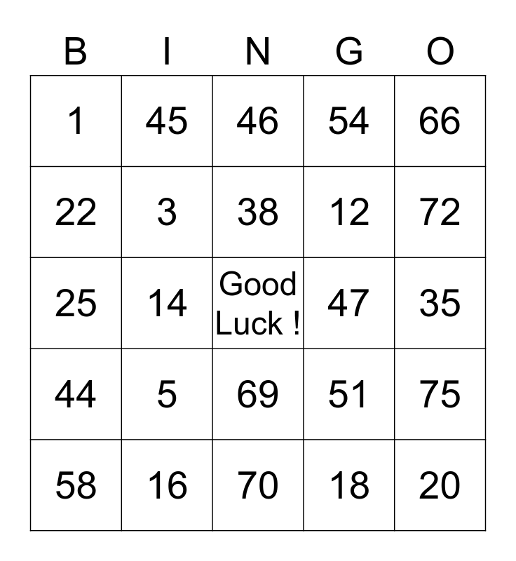 This bingo card has a free space and 24 words: 5, 16, 38, 58, 66, 1, 22, 45, 47, 69, 12, 25, 51, 75, 3, 18, 35, 46, 72, 14, 20, 44, 54 and 70.