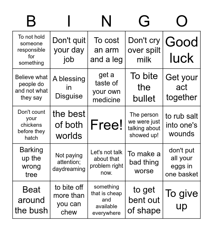 This bingo card has a free space and 29 words: Beat around the bush, Your guess is as good as mine., the best of both worlds, Tell me what you're thinking., To not hold someone responsible for something, To cost an arm and a leg, A blessing in Disguise, Not paying attention; daydreaming, The person we were just talking about showed up!, to bite off more than you can chew, to rub salt into one's wounds, To give up, something that is cheap and available everywhere, to get bent out of shape, Get your act together, Comparing two things that have nothing in common, Let's not talk about that problem right now., Barking up the wrong tree, Good luck, Don't count your chickens before they hatch, To make a bad thing worse, To start over, To bite the bullet, Believe what people do and not what they say, Don't cry over spilt milk, Don't quit your day job, don't put all your eggs in one basket, get a taste of your own medicine and To give someone the cold shoulder.