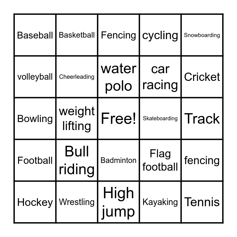 This bingo card has a free space and 34 words: Soccer, Kayaking, Golf, Horseback riding, Football, Cheerleading, Snowboarding, Hockey, Basketball, Boxing, water polo, Fencing, Shooting, Dodgeball, Skateboarding, Cricket, Wrestling, Bowling, Bull riding, Flag football, Badminton, Lacrosse, Baseball, Track, High jump, Tennis, cycling, gymnastics, car racing, volleyball, swimming, weight lifting, fencing and archery.