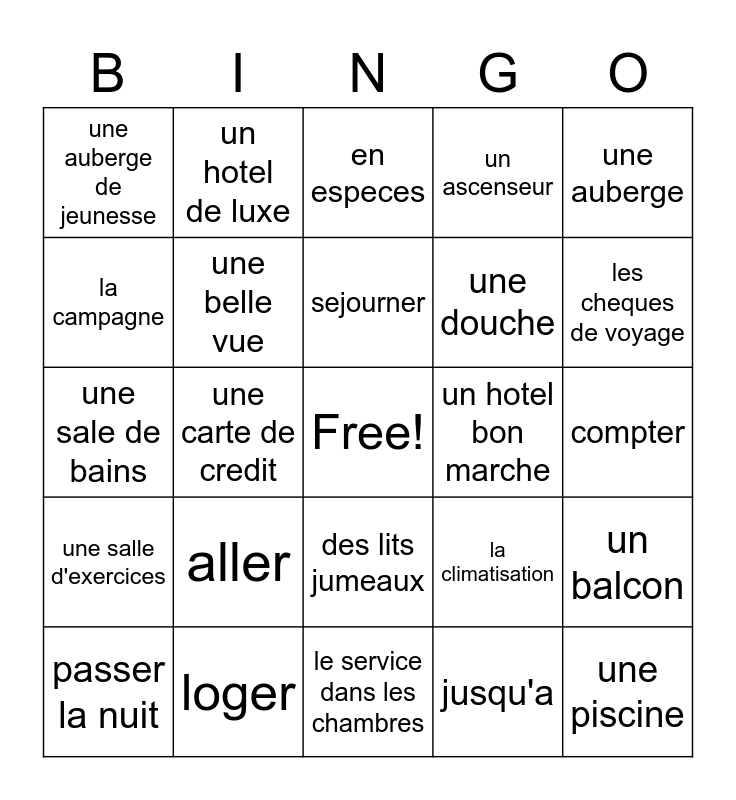 This bingo card has a free space and 24 words: aller, loger, sejourner, passer la nuit, une auberge, une auberge de jeunesse, la campagne, un hotel de luxe, un hotel bon marche, des lits jumeaux, une douche, une sale de bains, la climatisation, un balcon, une belle vue, jusqu'a, compter, en especes, les cheques de voyage, une carte de credit, une piscine, une salle d'exercices, un ascenseur and le service dans les chambres.