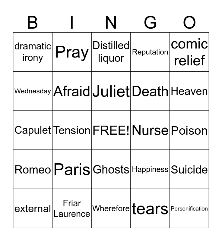 This bingo card has a free space and 24 words: Paris, Friar Laurence, Juliet, external, comic relief, dramatic irony, Wednesday, Pray, Nurse, Ghosts, Death, Capulet, Happiness, Suicide, Afraid, tears, Poison, Distilled liquor, Heaven, Tension, Personification, Romeo, Reputation and Wherefore.