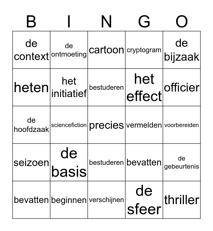 This bingo card has a free space and 24 words: de basis, beginnen, bestuderen, bevatten, de bijzaak, de context, heten, de ontmoeting, vermelden, bestuderen, het effect, de hoofdzaak, bevatten, de gebeurtenis, het initiatief, de sfeer, voorbereiden, cartoon, officier, sciencefiction, thriller, seizoen, cryptogram and verschijnen.