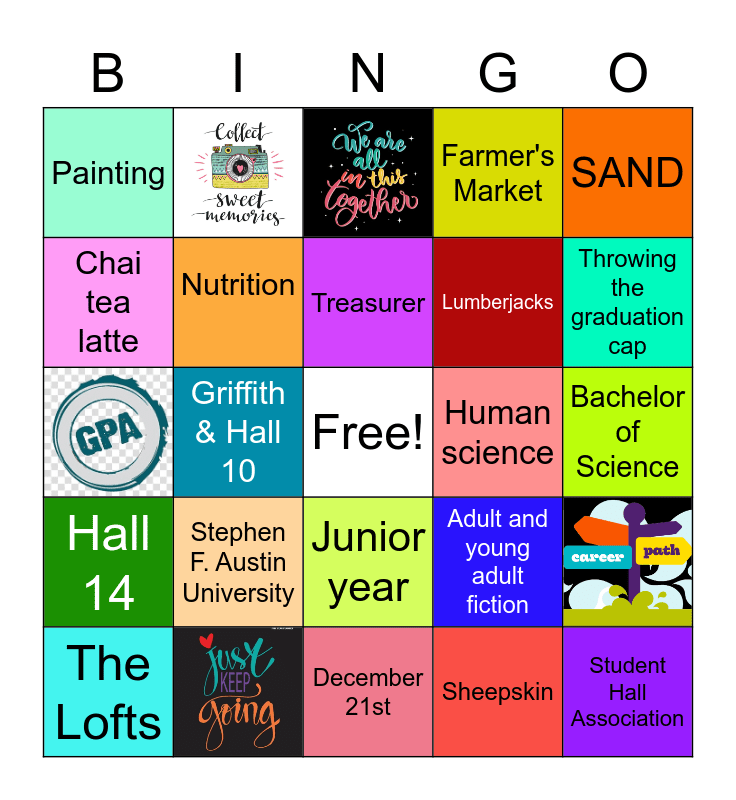 This bingo card has 12 images, a free space and 27 words: 3 years, Desk Assistant of the Year, Desk assistant, Nutrition, The Lofts, Junior year, Treasurer, 4 years, SAND, Hall 14, Griffith & Hall 10, Farmer's Market, Student Hall Association, Bachelor of Science, Human science, Stephen F. Austin University, Yellow, Painting, Reading, painting, and cooking, Adult and young adult fiction, Chai tea latte, December 21st, Lumberjacks, Throwing the graduation cap, Sheepskin, Step and 4.0.