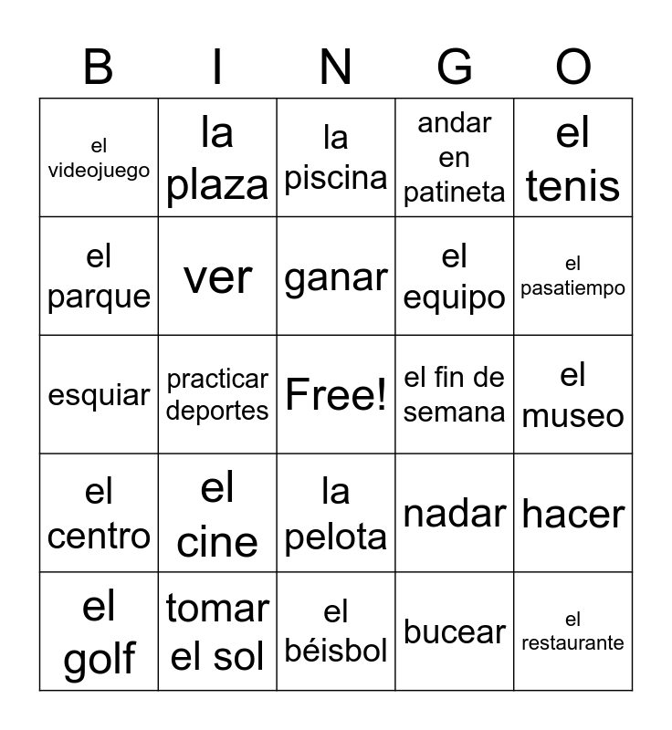 This bingo card has a free space and 24 words: el cine, tomar el sol, ganar, el golf, el tenis, el videojuego, el parque, la plaza, el fin de semana, la pelota, el equipo, esquiar, nadar, hacer, ver, bucear, el museo, la piscina, el pasatiempo, practicar deportes, el restaurante, el centro, andar en patineta and el béisbol.