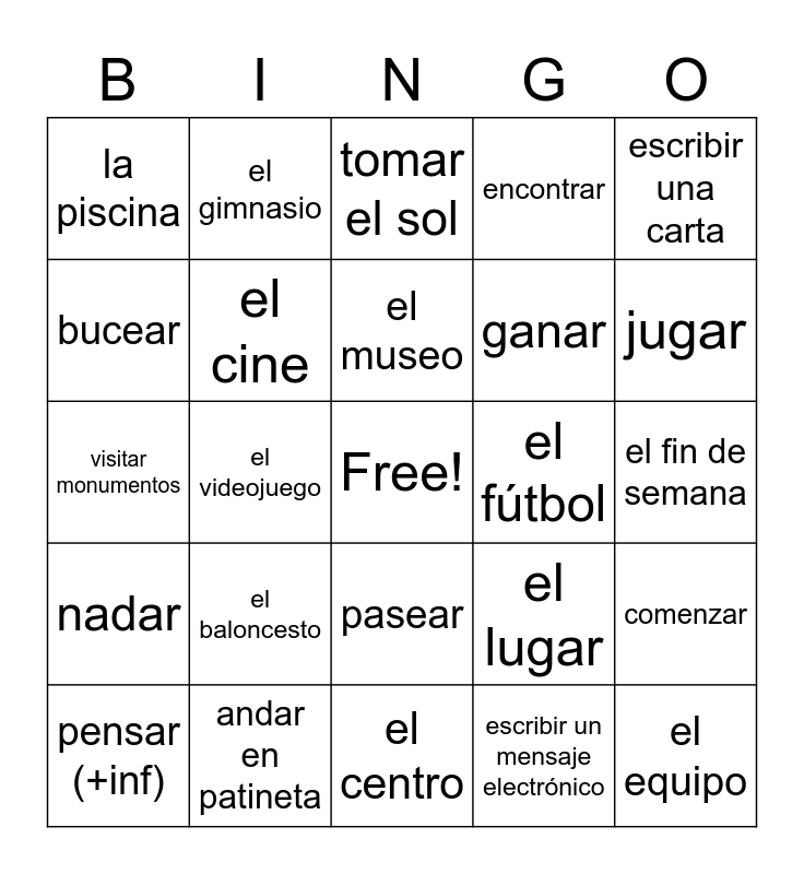 This bingo card has a free space and 24 words: el baloncesto, andar en patineta, el museo, pensar (+inf), escribir una carta, la piscina, bucear, el gimnasio, el fútbol, pasear, ganar, visitar monumentos, el lugar, comenzar, el cine, escribir un mensaje electrónico, el fin de semana, tomar el sol, jugar, el videojuego, el equipo, nadar, encontrar and el centro.