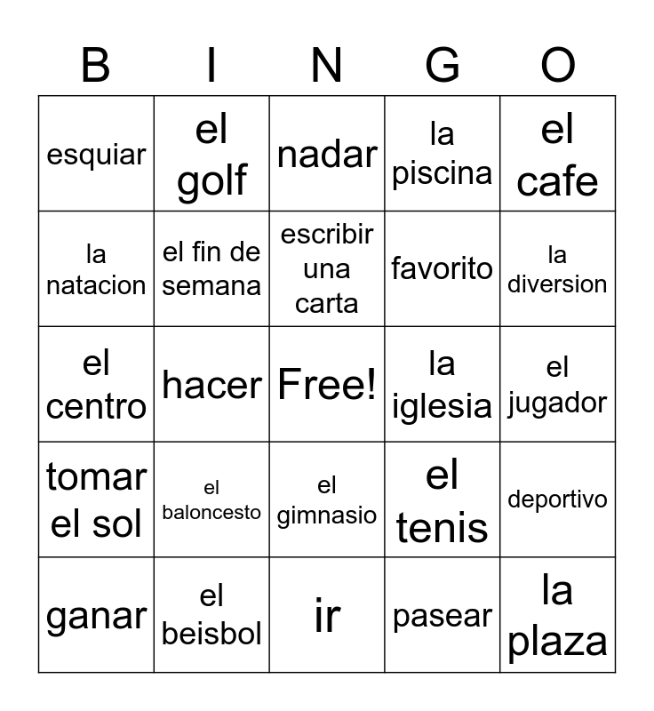 This bingo card has a free space and 24 words: el baloncesto, el beisbol, escribir una carta, ganar, el cafe, esquiar, la natacion, el golf, la iglesia, el gimnasio, favorito, el centro, el tenis, deportivo, el fin de semana, pasear, el jugador, nadar, la diversion, hacer, la plaza, tomar el sol, la piscina and ir.