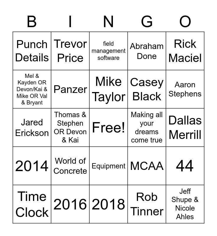 This bingo card has a free space and 75 words: help & innovate, build & maintain, field management software, simple solutions & strong partnerships, vision with feedback, challenges with optimism, follow through, listen, care, serve, right thing, as a team, resourceful, long term, Mike Taylor, Mel & Kayden OR Devon/Kai & Mike OR Val & Bryant, Bryant Jensen, Thomas & Stephen OR Devon & Kai, Kaleb Shumway & Tyler Barnes, Jeff Shupe & Nicole Ahles, Mel Miller, Rick Maciel, Gene Snelling, Jared Erickson, Panzer, Trevor Price, Abraham Done, Matt Clough, Dylan Ring, Brett, Casey, Dallas, Kaleb, A-Core, Brazos, Noorda, Willow Creek, Jonathan Kunz, Three: Android, iPad, iPhone, Adam Hellewell, Facebook, MCAA, Aaron Stephens, Casey Black, Nasser, Justin Edwards, Dallas Merrill, Rob Tinner, Incomplete items, Tycon Construction, Erin Laird, Sheryl Frost, One, Schedules, Time Clock, Punch Details, Jobs, Time Assignment, Production, Equipment, Notes & Photos, Materials, Documents, Misc. Info, Job Signoff, True, False, ConExpo, World of Concrete, D, C, B, A, Making all your dreams come true, Brett Fairbourn, Kaleb Shumway, Our core values, 44, 2014, 2016, 2017, 2018 and 2019.