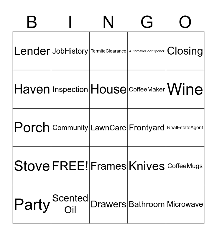 This bingo card has a free space and 24 words: FREE!, Scented Oil, House, Party, Closing, Lender, Haven, JobHistory, Frontyard, Frames, CoffeeMaker, Porch, Knives, CoffeeMugs, Inspection, Bathroom, RealEstateAgent, TermiteClearance, Wine, Community, Microwave, Stove, AutomaticDoorOpener and Drawers.