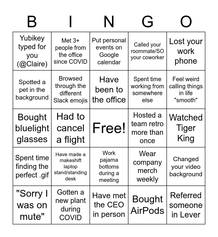 This bingo card has a free space and 24 words: Have made a makeshift laptop stand/standing desk, Gotten a new plant during COVID, Have been to the office, "Sorry I was on mute", Lost your work phone, Yubikey typed for you (@Claire), Spotted a pet in the background, Met 3+ people from the office since COVID, Hosted a team retro more than once, Work pajama bottoms during a meeting, Spent time working from somewhere else, Bought bluelight glasses, Wear company merch weekly, Changed your video background, Browsed through the different Slack emojis, Bought AirPods, Watched Tiger King, Put personal events on Google calendar, Feel weird calling things in life "smooth", Had to cancel a flight, Referred someone in Lever, Spent time finding the perfect .gif, Called your roommate/SO your coworker and Have met the CEO in person.